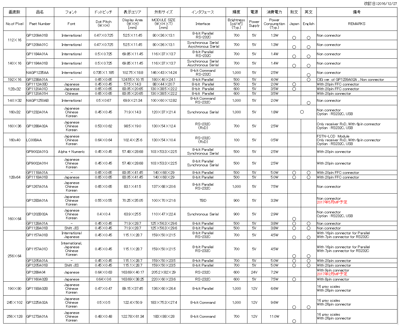 FUTABA Standard VFD Module List (GP) Ver201612_D_JP